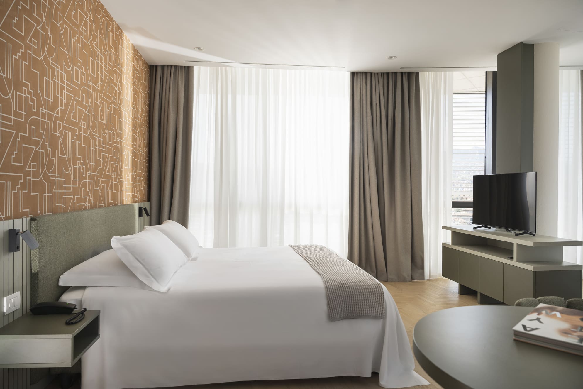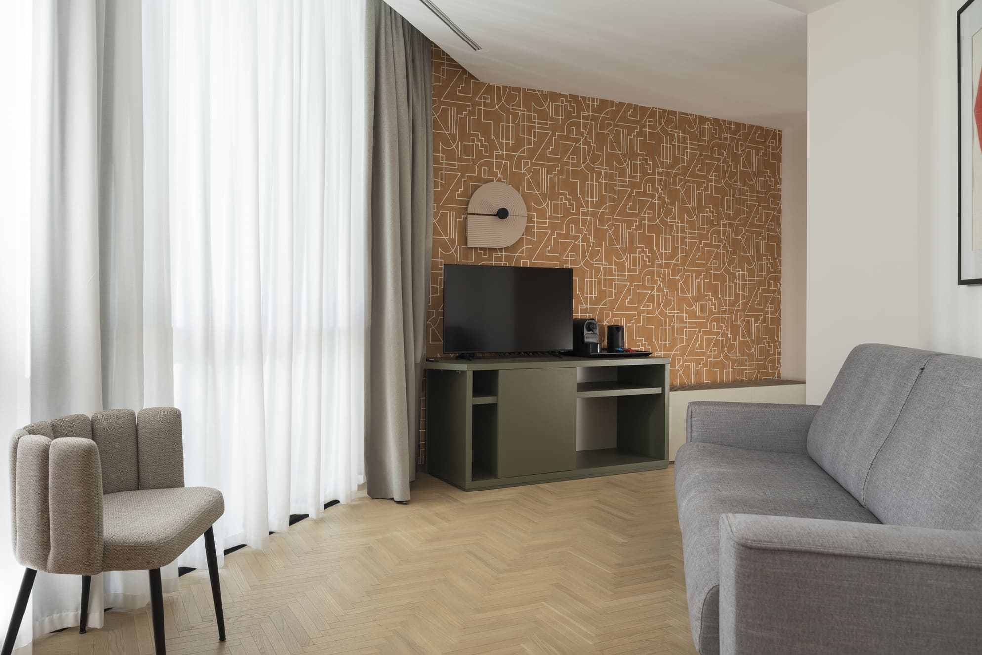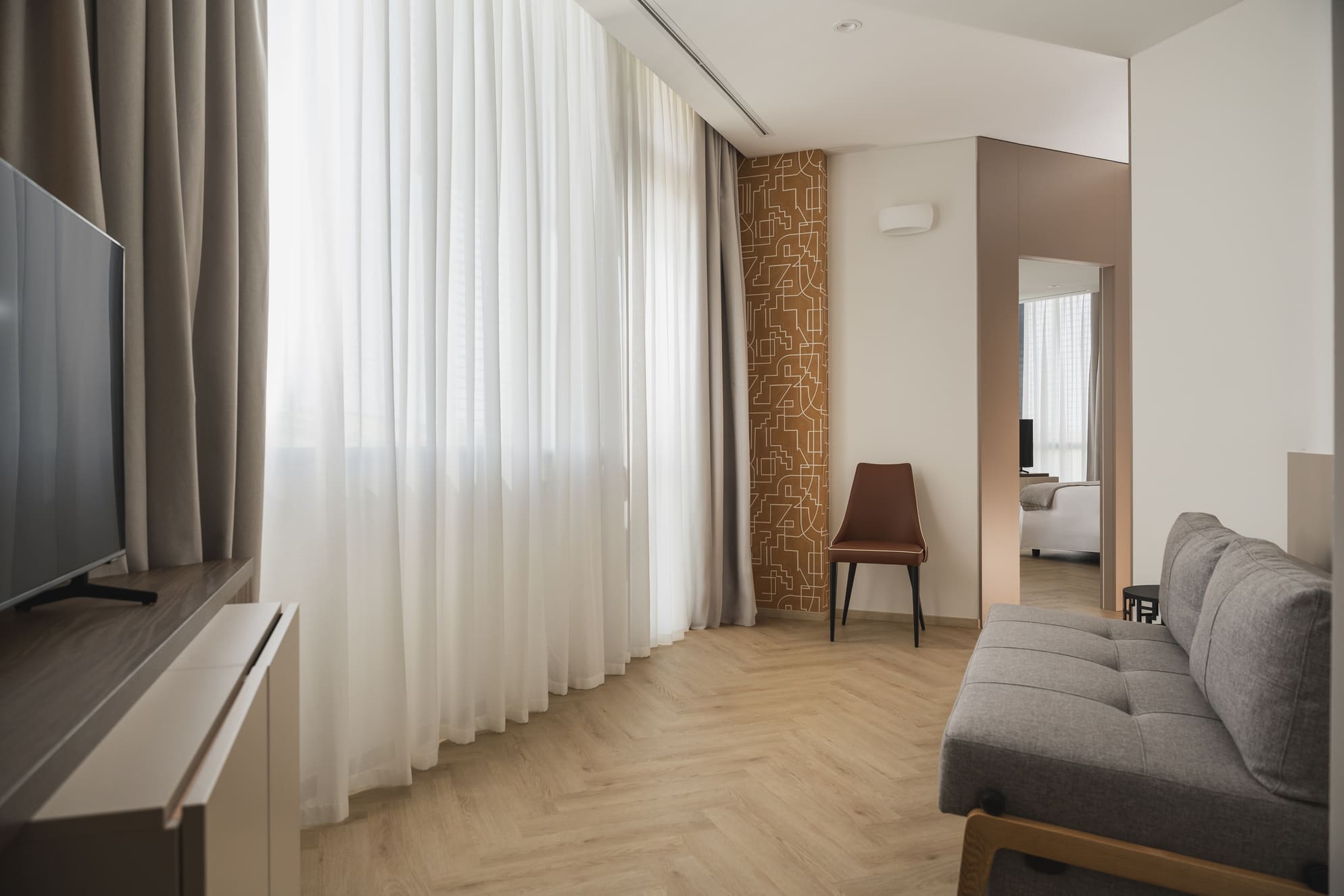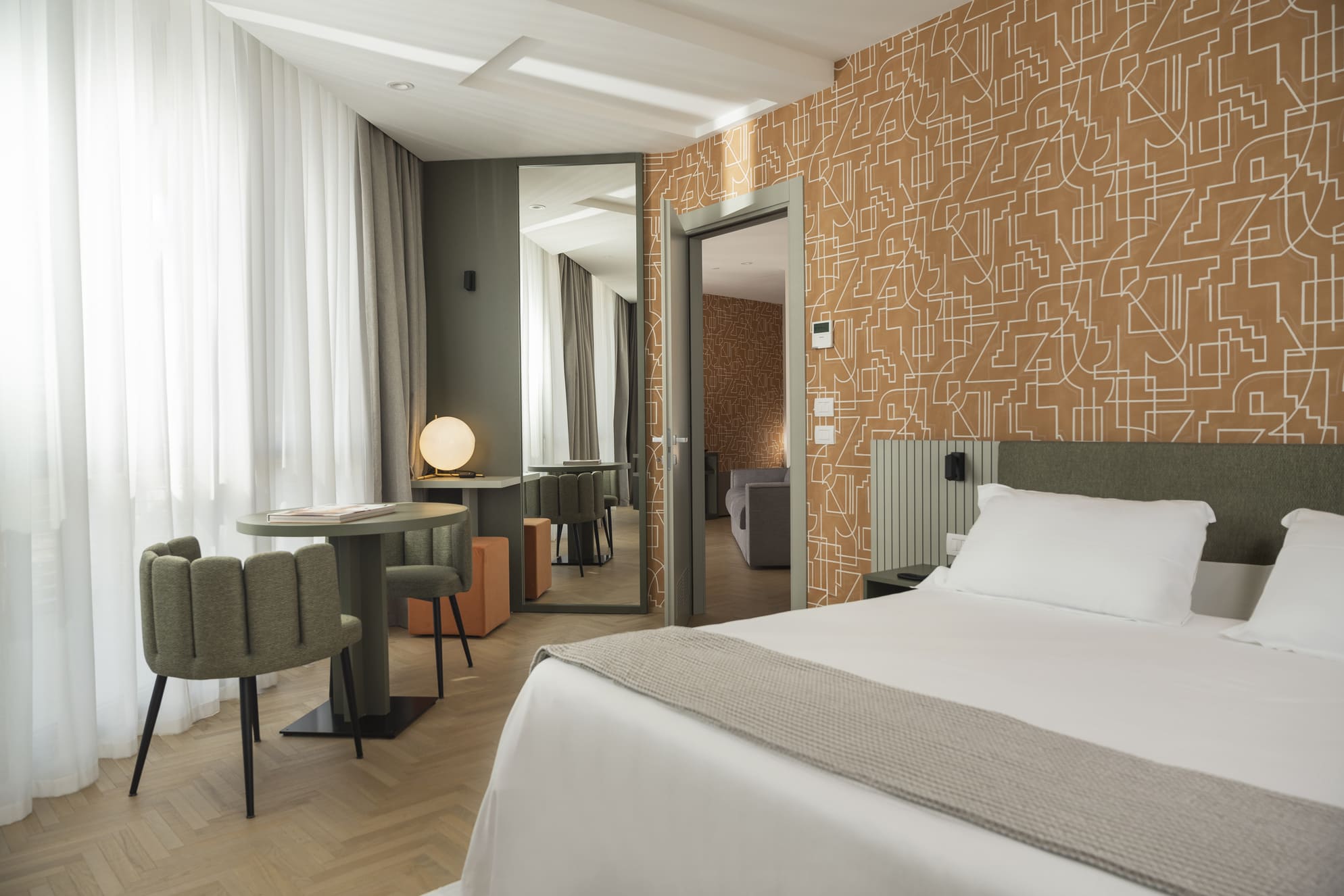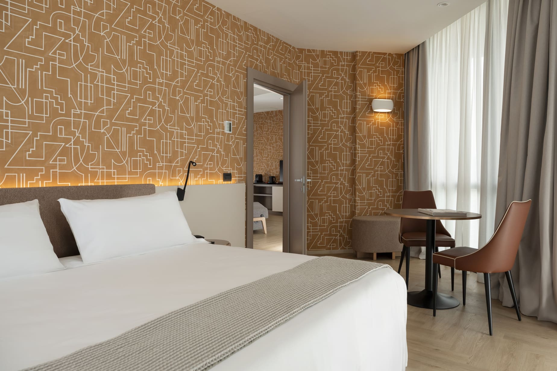 La Junior Suite accoglie gli ospiti in un ambiente elegante e moderno con due spazi distinti: la camera da letto, spaziosa e silenziosa, e un’anticamera, ideale come spazio di relax o di lavoro.